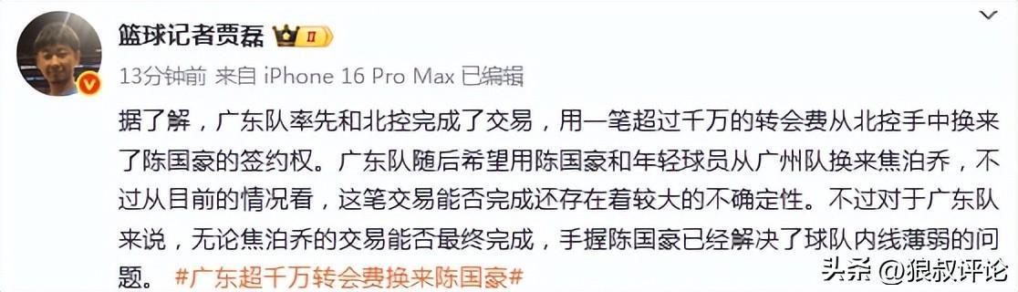 媒体人贾磊发文点评:据了解,广东队率先和北控完成了交易,用一笔超过千万的转会费从北控手中换来了陈国豪的签约权。